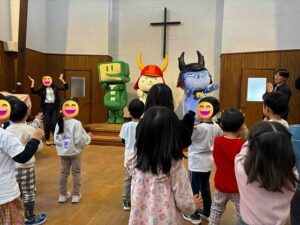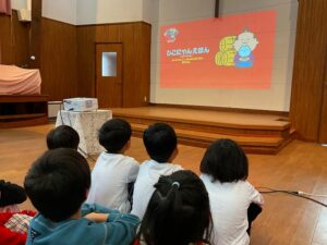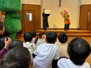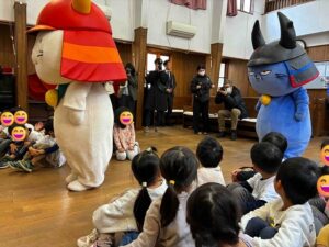 本日、『彦根税務署』と『公益財団法人彦根納税協会』主催の「ひこにゃんえほんで暮らしを支える税の大切さを学ぶ」というイベントが、当園で行われました😊このために書き下ろされた、もへろんさんの『ひこにゃんえほん~とくべつへん~よいにゃんことみんなのおこめのおはなし』📖から、「お殿様がみんなからお米を集めて、道の大きな穴や壊れた橋を直すのに、大工さんにお米を渡して、みんなで助け合うんだよ😄」と。そしてクイズ❓をして盛り上がり…😃 その後、もへろんさんの紹介で、ひこにゃんとわるにゃんこ将軍も来てくれて、イータくんも含めて、みんなでひこにゃん音頭を踊りました😊みんなで記念撮影をしたり、インタビューを受けたり…大勢の大人に囲まれて緊張気味のみんなでしたが、楽しんでくれたようです😊