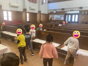 8日(水)イースター礼拝を行ないました😊園長先生からの話しを聞いて、「イースターはこんな感じの事なのか、いつも神さまがそばにいてくれるのか」と、イメージを膨らませ…。