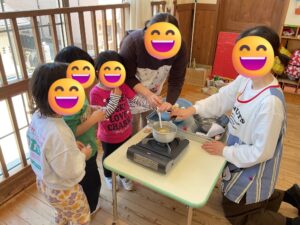 1回目はお部屋で、2回目は教会の礼拝堂で、3回目は園庭で、天気が良くみんな大興奮で探してくれました😄午後からはな組はイースターエッグ🥚作りをし、